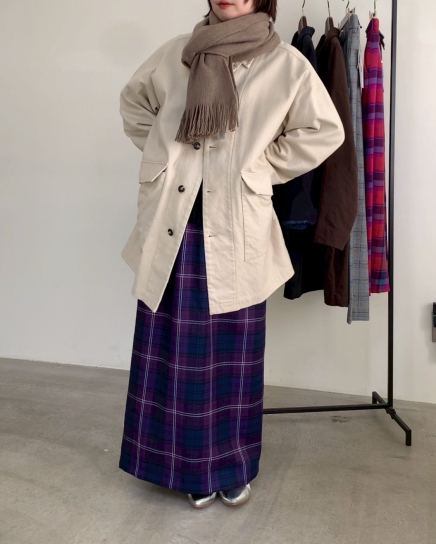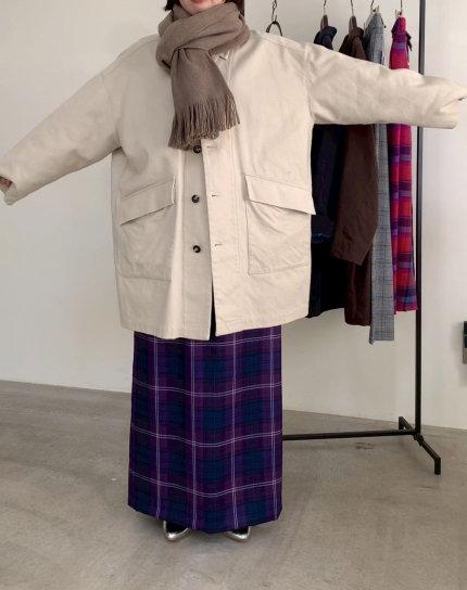 お尻が隠れる丈感でタイトスカートにもバランスよく合わせられます。