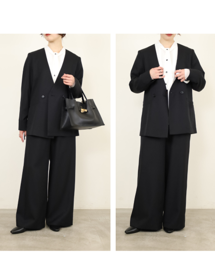 ¥25,300(税込)すっきりとしたノーカラーデザインが印象的なダブルジャケット。