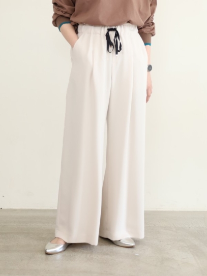上質な素材感としなやかなドレープが美しいワイドパンツ。